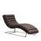 Ylellinen leposohva, jossa on ajaton muotoilu ja huolellisesti suunnitellut yksityiskohdat. Muotoiltu istuin on verhoiltu tummanruskealla nahalla, ja sitä koristavat erottuvat vaakasuorat saumat, jotka tuovat syvyyttä ja luonnetta.